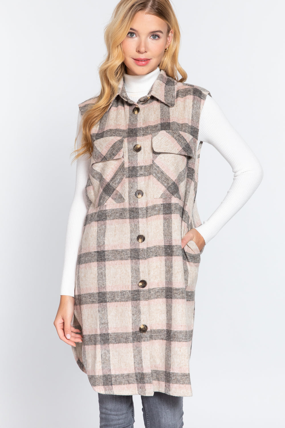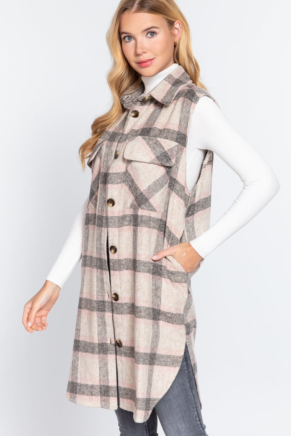 SLEEVELESS NOTCHED COLLAR FRONT POCKET BUTTON DOWN PLAID VEST