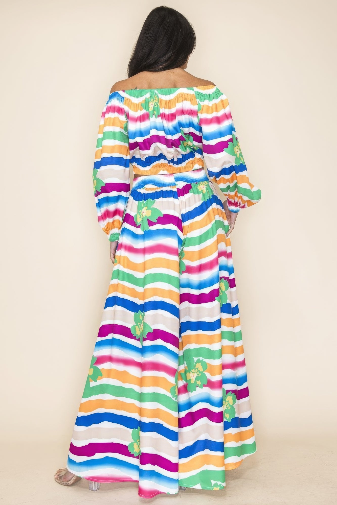 Enhance your wardrobe with our Off-Shoulder Top and Wide Pants Set in Multi. Perfect for embracing sunny days with style and comfort!